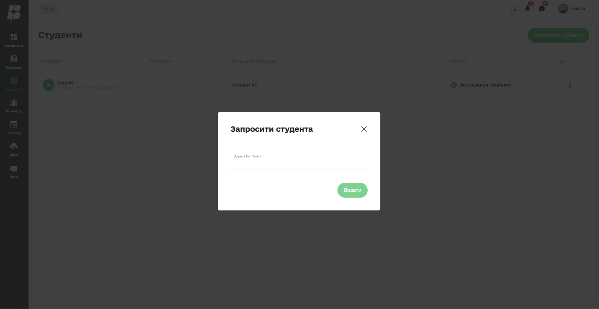Для того, щоб додати студента на навчання, вам потрібно зареєструвати його на вашому акаунті. Для реєстрації перейдіть у вкладку «Студенти» і натисніть «Запросити студента».