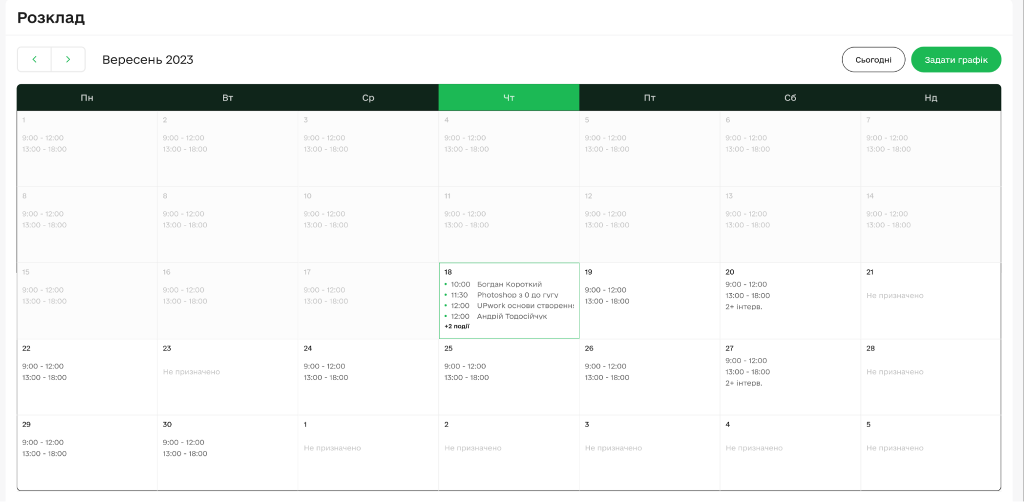 Розклад на платформі — важлива частина функціоналу. Тут ви можете бачити усі призначені сесії по вашому аканту (ваші і вашої команди). Ваші студенти можуть бачити усі свої Live уроки, або менторські заняття з датою та часом початку сесій. Студенти або представники акаунту зможуть одразу переходити на заняття прямо із вкладки «Розклад».