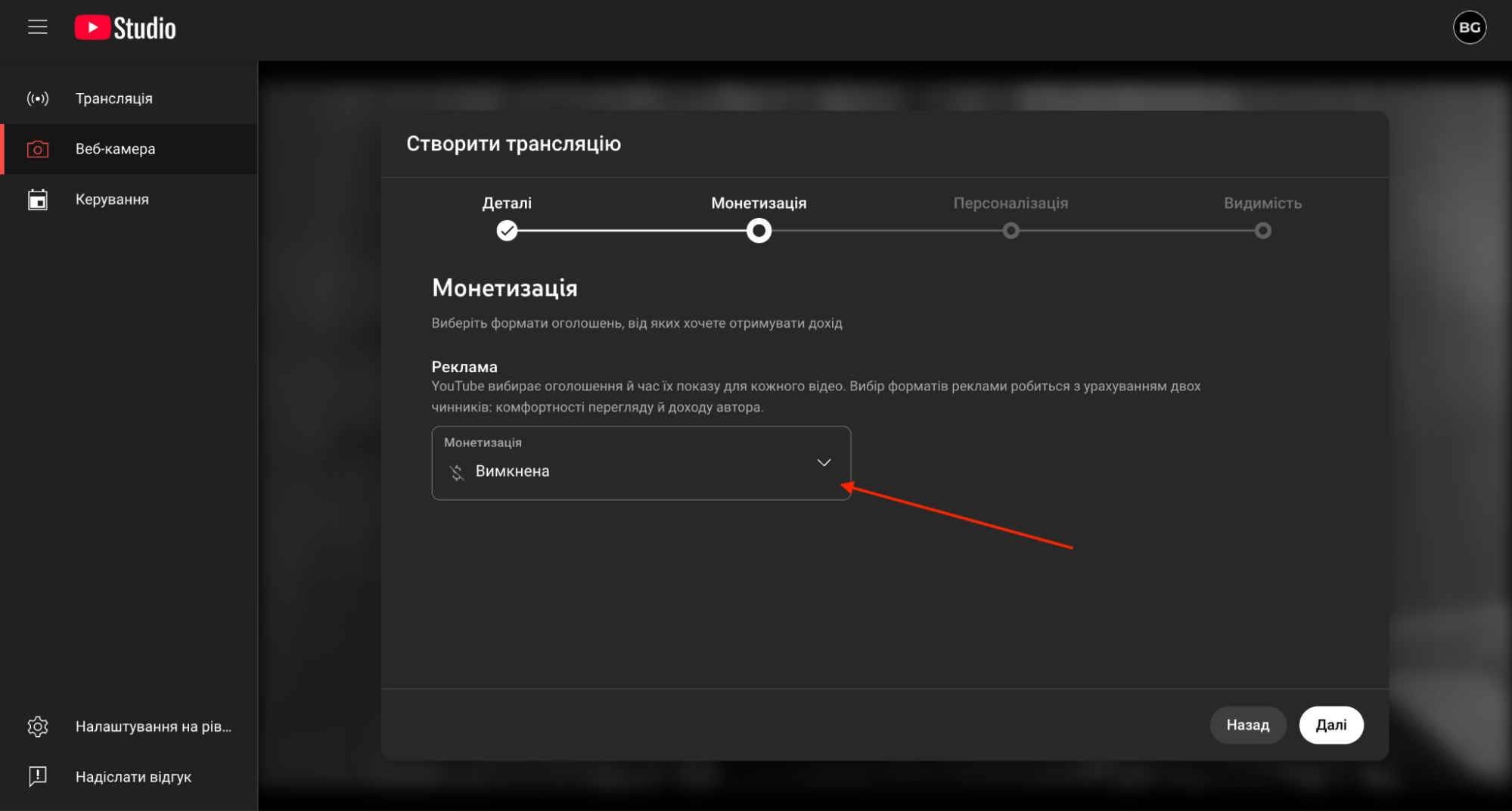 Наступне вікно “Монетизація” там можна обрати “Вимкнена” (ткк нашою метою є суто запустити трансляцію) та натиснути кнопку “Далі”.