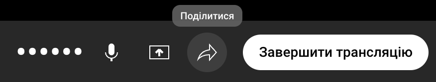 Далі у вікні трансляції, на нижній панелі, треба натиснути кнопку поділитися, щоб відкрити вікно посилання на вебінар.