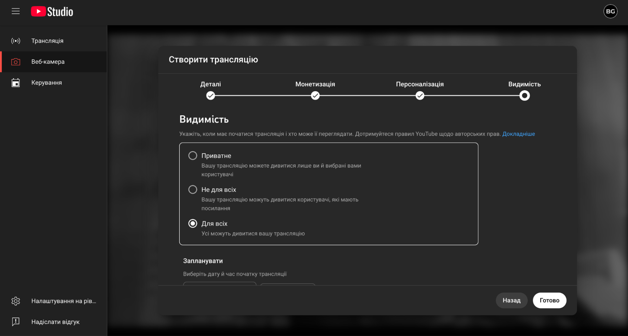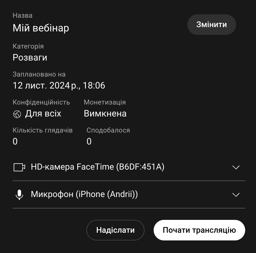У вікні створення трансляції дайте назву та опис своїй трансляції (це може бути назва і опис вебінару).