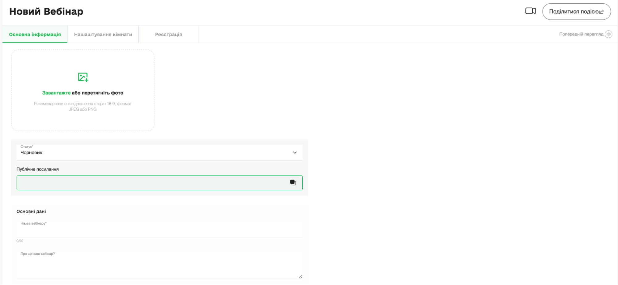 У вкладці «Основна інформація» додайте промо для вебінару (для відображення на вході кімнати та у кімнаті вебінару). Пропишіть назву та опис вебінару, натисніть «Зберегти». Після збереження з’явиться можливість скопіювати публічне посилання для шерингу на реєстрацію глядачам.