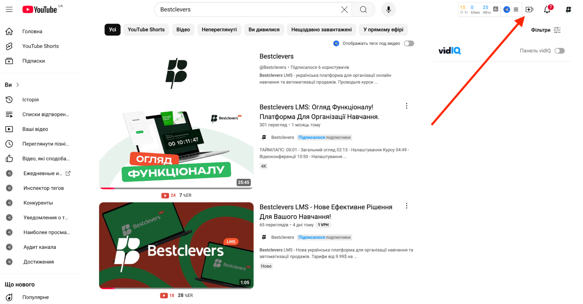 Для того, щоб запустити трансляцію YouTube, зайдіть у свій обліковий запис Google на YouTube та у верхній панелі меню натисніть кнопку створити (камера з плюсом).