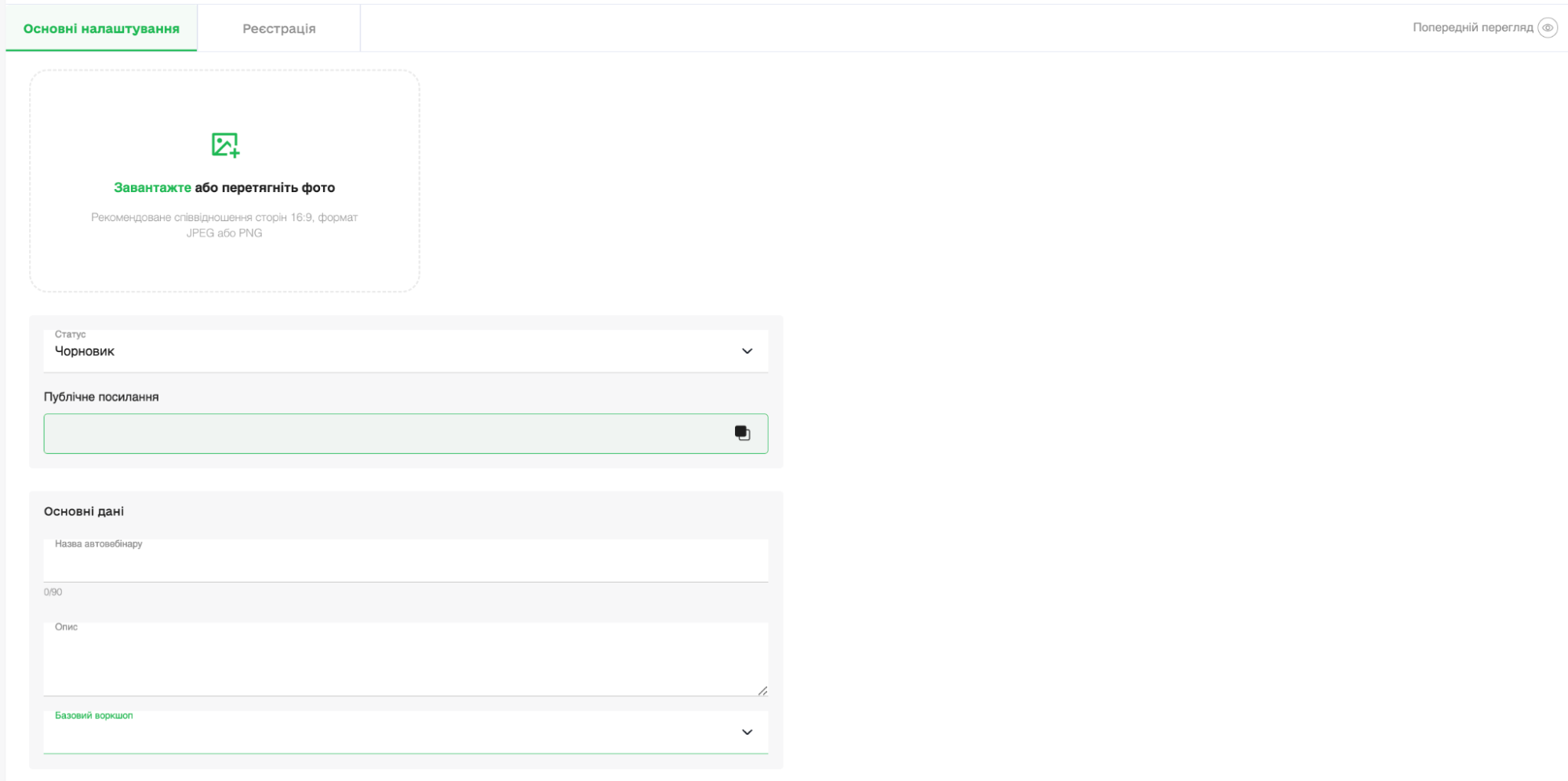 Введіть назву та опис автовебінару. Оберіть з поля «Базовий воркшоп» вебінар, який вже проведено та збережено.