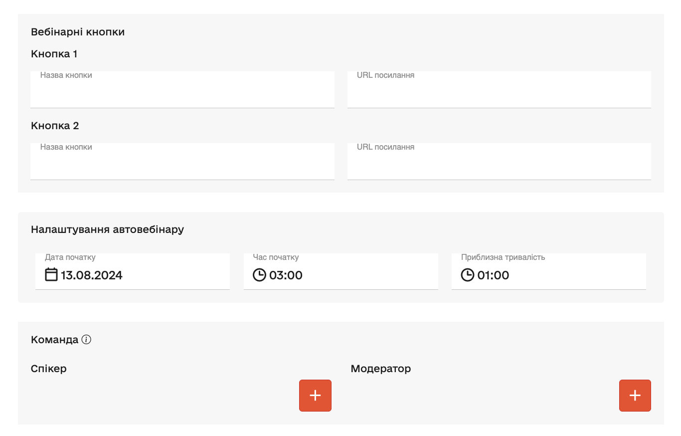 Налаштуйте «Вебінарні кнопки» за потреби. Оберіть час проведення автовебінару та виберіть команду для модерації автовебінару (за потреби). Ви можете зробити автовебінар доступним для будь-кого або налаштувати запит даних при вході у кімнату автовебінару.
